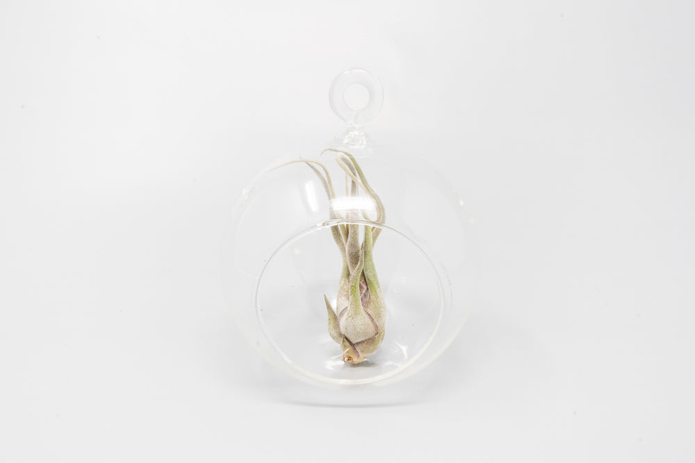 A simple globe terrarium with your choice of air plant. Admire the plant's unique form from all angles of the glass. No dirt required. They have a hook for hanging or you can place them on their flat bottom.