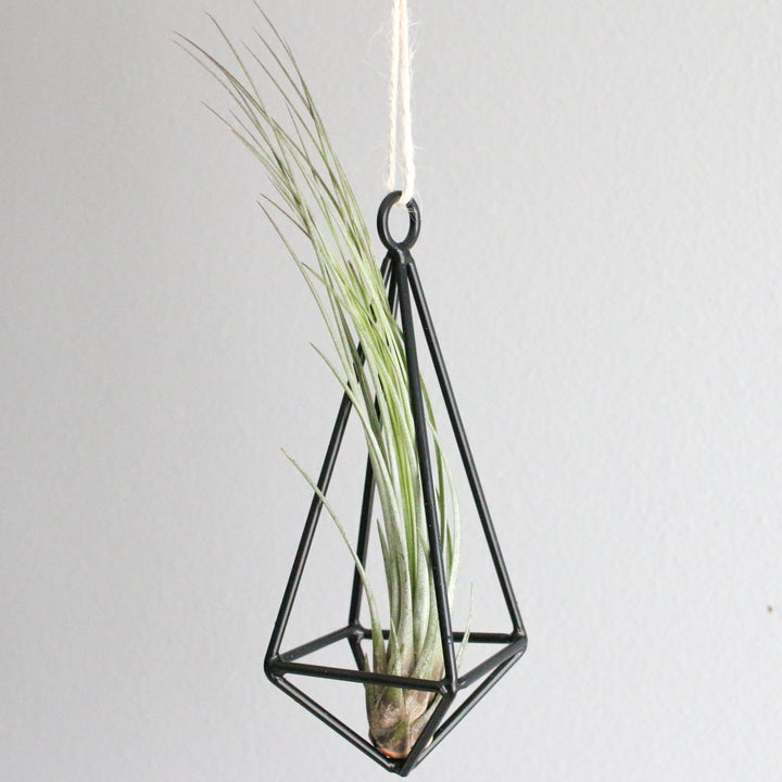 Our handcrafted metal pendants are a simple way to suspend tillandsia in the air. Gently place a single plant in the lower diamond of the frame and hang in a bright spot in your home, office or studio. These iron structures will not rust or discolor from moisture as they are dipped in a plant-safe sealant. Every pendant comes with an air plant, hand-selected to fit perfectly inside the metal frame.