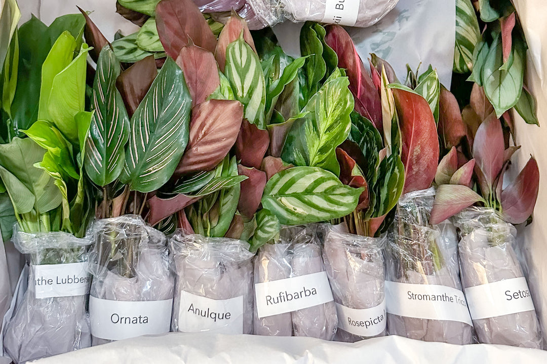 Upon arrival, prepare to pot-up your new Calatheas as soon as possible. Depending the variety, pot size and your preference, 1-5 stems can be added to each container. Water thoroughly and maintain high humidity for the fast recuperation at your business.