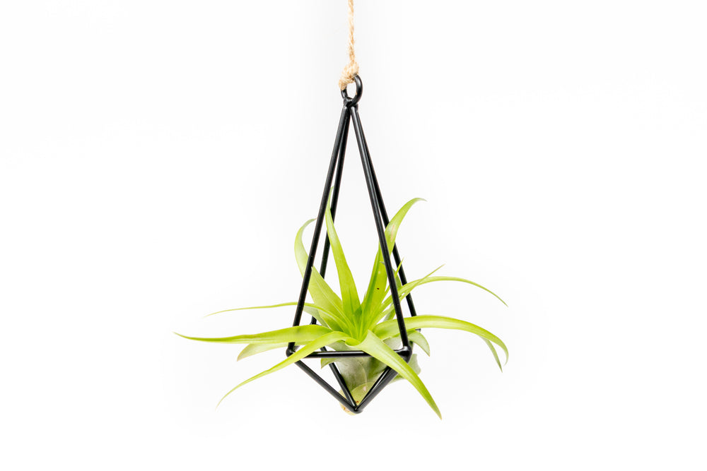 Our handcrafted metal pendants are a simple way to suspend tillandsia in the air. Gently place a single plant in the lower diamond of the frame and hang in a bright spot in your home, office or studio. These iron structures will not rust or discolor from moisture as they are dipped in a plant-safe sealant.